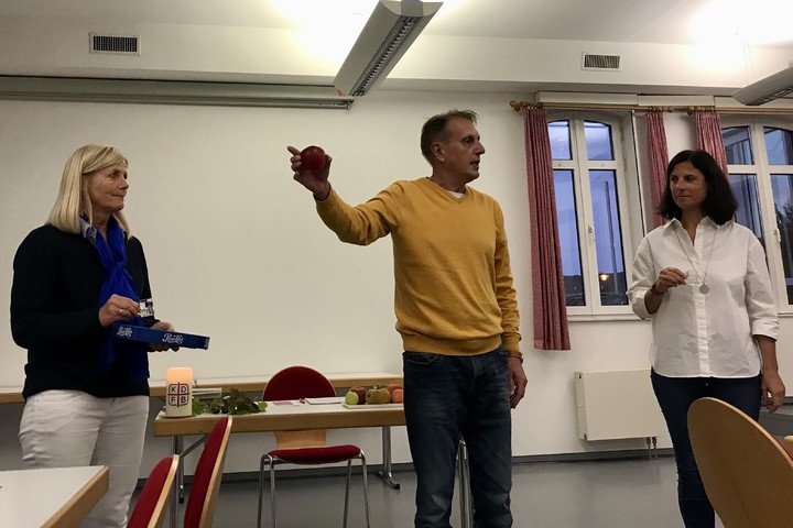 Klaus erzählte, auf sehr unterhaltsame Weise, alles Wissenswerte über das Lieblingsobst der Deutschen, den Apfel. Wir Frauen erfuhren nicht nur woher der Apfel stammt, wie viele verschiedene Apfelsorten es gibt oder wie man Apfelbäume veredelt, sondern auch, dass Großwallstadt seinen „eigenen Apfel“ hat: den „Wällster Rosenapfel“. Am Ende des Vortrags probierten wir die typischen Apfelsorten unserer Region wie z. B. Brettacher und Boskoop